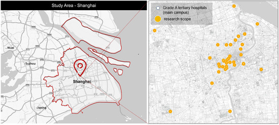This study focuses on Shanghai, which, as a metropolis, has an influential healthcare system and a well-developed urban data infrastructure including comprehensive facility information, road networks, and street views, which supports quantitative morphological analysis. Additionally, with the rapidly aging population in Shanghai, human-centered urban development integrating medical convenience with daily life quality has gained increasing attention. This study can provide targeted strategies and design guidance for both the renewal of existing hospital-adjacent areas and the planning of future hospital-oriented urban spaces. Regarding research objects, Shanghai’s medical resources center on Grade A tertiary hospitals, which are large-scale, have extensive service coverage, and attract substantial visitors both living nearby and from other regions, perfectly aligning with the HOD definition that positions hospitals as key regional facilities. Therefore, this study selected Grade A tertiary hospitals listed by the Shanghai Municipal Health Commission in 2024 for empirical research [28], with the 15 min walking catchment around each hospital defined as the research scope for quantitative measurement and prototype construction (Figure 1).