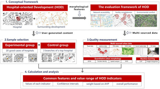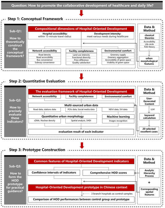 The main objective of this study is to explore the paradigm for the collaborative development of healthcare and daily life, which is referred to as Hospital-Oriented Development (HOD). To achieve this objective, study proposed a three-step framework, deriving from urban morphological features and multi-sourced urban data, as illustrated in Figure 2.