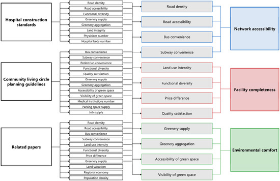 The first part involved concept formulation and framework construction. Guided by the goal of promoting coordinated development between hospitals and their surrounding urban spaces, HOD was defined as a comprehensive spatial–functional assessment that quantified synergies through two core dimensions: “Hospital accessibility (H)” and “Development intensity (D)”. “H” focused on ensuring the effective operation of hospital functions, reflecting the timeliness and efficiency of healthcare services for both long-term residents and temporary visitors. “D” emphasized the ability of surrounding spaces to meet diverse needs and to provide a comfortable experience during healthcare-related activities. Based on this dual-dimensional definition, HOD performance could be comprehensively evaluated through three aspects: “Network accessibility”, “Facility completeness”, and “Environmental comfort”. Then, the morphological features were taken as drivers to quantitatively measure these aspects. Given the lack of existing evaluation indices specifically tailored to ‘healthcare–daily-life’ development, an integrated approach to indicator selection was adopted, drawing from both hospital planning and living circle standards and research to ensure alignment with both medical functionality and daily-life needs. Specifically, as shown in Figure 4, relevant indicators were systematically reviewed and extracted from (1) hospital construction standards [29,30]; (2) community living circle planning guidelines [31,32]; and (3) related papers, especially those that used quantitative evaluation methods [33,34,35]. Through screening, integration, and refinement—based on relevance to the defined aspects and feasibility of morphological quantification—four indicators were selected for each aspect, resulting in a twelve-indicator evaluation framework to support the subsequent analysis.