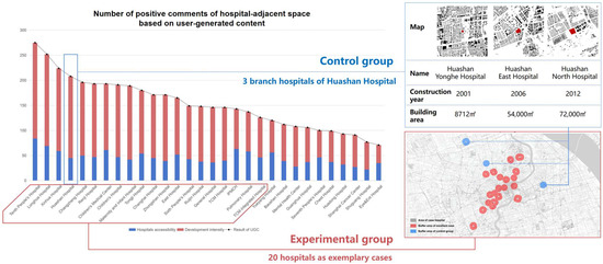 Secondly, the experimental and control groups were selected based on UGC, with Xiaohongshu chosen as the primary data source. Compared with other social media platforms like Weibo, Xiaohongshu places greater emphasis on users’ sharing of daily life experiences. Specifically, when searching through healthcare experiences, posts on other platforms often focus on the hospitals themselves such as medical quality and management level, resulting in excessive noise for data analysis. However, Xiaohongshu contains more descriptions of the surrounding facilities and life experiences, which better reflect the performance of HOD. For data collection, “surroundings of XXX hospital” was searched for each Grade A tertiary hospital in Shanghai, and those with fewer than 100 posts were excluded, resulting in a final set of 30 hospitals. From each hospital, the 100 most recent posts were extracted, and keyword frequency analysis was performed on the text by a Large Language Model (LLM). The keywords were selected according to the definition of HOD, capturing expressions related to accessibility and development intensity. For accessibility, keywords included “交通便利” (convenient transportation), “地铁” (subway), and “公交” (bus), etc. Development intensity included facility and environment aspects. The former were words like “美食” (good food), “玩” (play), “设施” (facilities), “好吃” (delicious), “好玩” (fun), “超市” (supermarket), “餐厅” (restaurant), and “citywalk”, etc., while the latter were words like “环境好” (good environment), “公园” (park), and “绿化” (greening), etc. The total frequency of these keywords was then calculated for each hospital, and the top 20 hospitals with the highest counts were selected as exemplary cases representing strong HOD performance (Figure 5). Meanwhile, three branches of Huashan Hospital, a representative exemplary case, were selected as the control group. This selection was based on two key considerations. On the one hand, these branches were constructed during China’s rapid urbanization over the past 20 years, a period when urban expansion prioritized the hospital itself over synergistic development with the surrounding areas, leading to fragmented “hospital–surroundings” relationships that typify underdeveloped HOD scenarios. Therefore, it enables validation of the feasibility of the HOD evaluation method. On the other hand, the new round of urban renewal would focus on these areas, so specific issues and targeted improvement strategies could be raised after evaluation.