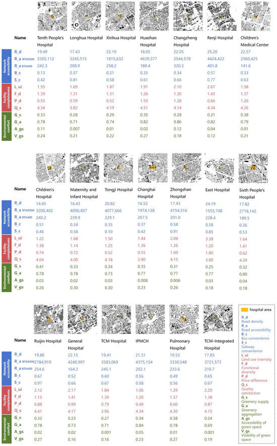 Subsequently, the 95% confidence interval for the mean of each indicator was calculated to identify the recommended benchmarks and common features of hospital-adjacent areas with favorable HOD performance (Figure 9). The following section presents the detailed calculation results and quantitative analyses for the three dimensions.