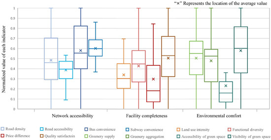 In terms of the boxplots, the mean is represented by an “×” inside the box, the median by a horizontal line across the box, and the first (Q1) and third (Q3) quartiles by the bottom and top edges of the box, respectively (Figure 7). The overall performance of the “facility completeness” dimension is lower than that of the other two dimensions, with the mean and median values of its three indicators all below 0.5, showing that the diversity of the quantity, type, and price of facilities in hospital-adjacent areas requires more attention and improvement in current HOD practice.