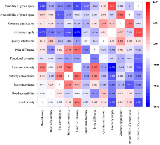 In terms of the heatmap, the Pearson Correlation Coefficient (PCC) was used to measure the inter-indicator correlations, revealing clearly positive or negative correlation patterns (Figure 8). Specifically, indicators within the same dimension tend to exhibit positive correlations, while certain developmental conflicts exist between different dimensions. For instance, “land use intensity” shows a strong negative correlation with “greenery supply” (r = −0.751), whereas “visibility of green space” and “greenery supply” demonstrate a strong positive correlation (r = 0.745). Notably, indicators across different major dimensions of “network accessibility” and “facility completeness” present relatively strong positive correlations, showing that the areas with convenient subway and bus access tend to have higher land use intensity. Correlation analysis identifies the key challenges in collaborative development, namely building a pleasant environment under urban modernization.