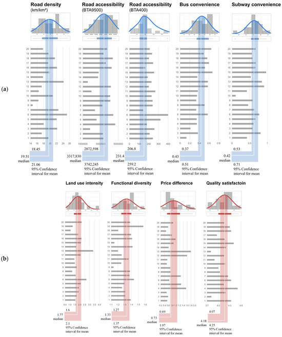 In most of the excellent cases, the network accessibility is relatively good, both with private cars and public transportation, resulting in significantly higher values for the former two indicators than those in surrounding urban areas. As shown in Figure 9a, for road density, the 95% confidence interval is (18.45 km/km2, 21.06 km/km2), generally 15% higher than that of surrounding parts of the hospital-adjacent area (16.06 km/km2, 17.705 km/km2). Regarding road accessibility, betweenness centrality—measuring the degree to which a road segment is selected as a passage [36]—is used to assess BTA9500 and BTA400. This dual measurement aligns with the service scope of large hospitals, which cater to both nearby residents and patients from broader urban or even regional areas. The 95% confidence intervals are about (29 × 104, 37 × 104 for BTA9500 and 206.8, 259.2 for BTA400), with more than 8% of roads being good at both global and local analysis. The latter two indicators, evaluating bus and subway convenience, are composite metrics integrating distance decay coefficients, station coverage, density, and quantity. Their 95% confidence intervals are (0.37, 0.51) and (0.53, 0.71), respectively.
