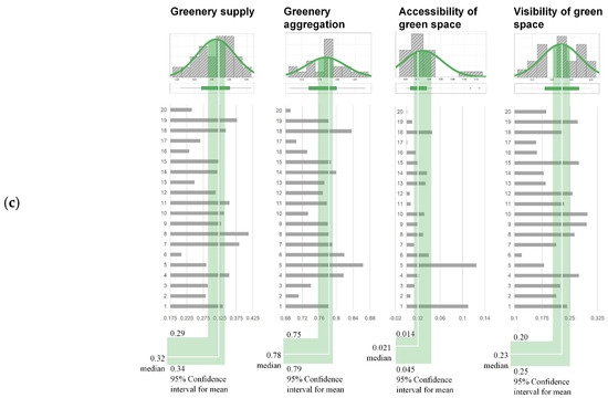 Environmental comfort has a significant impact on the experiential quality of hospital users [38], and as a key component of environmental comfort in outdoor spaces, greenery has been consistently linked to improved physical and psychological well-being [39]. As shown in Figure 9c, NDVI presents the greenery supply, whose 95% confidence interval is 0.29–0.34, slightly higher than Shanghai’s central-area average (0.30). Conversely, for greenery aggregation, the interval of green-space concentration (0.75–0.79) is lower than the central-area average (0.80), indicating more dispersed greenery distribution. For the accessibility and visibility of green space, the former is operationalized via the proportion of large-scale green space (1.4%, 4.5%), while the latter is the green rate (20%, 25%). Generally, densely distributed green spaces are associated with good HOD performance.