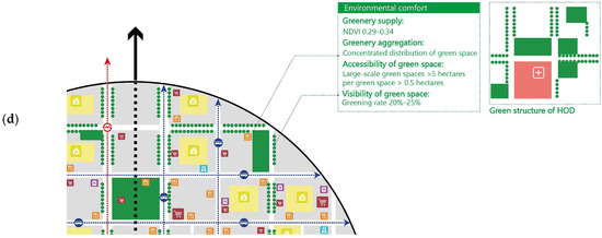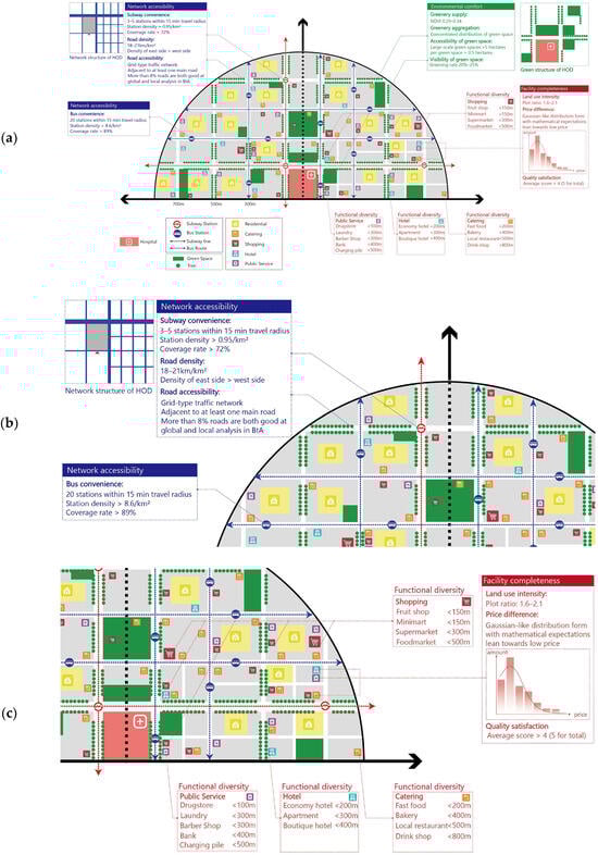 Based on quantitative measurements and multi-scale analyses using the confidence interval and weighted scores, spatial features represented by numerical values could be transformed into graphical form to directly guide urban design. Accordingly, an HOD prototype in the Chinese context was constructed (Figure 10a). Focusing on the daily living scope in a hospital-adjacent area, the prototype was mapped within an 800 m radius as a healthcare–daily life circle, corresponding to a 15 min walking catchment.