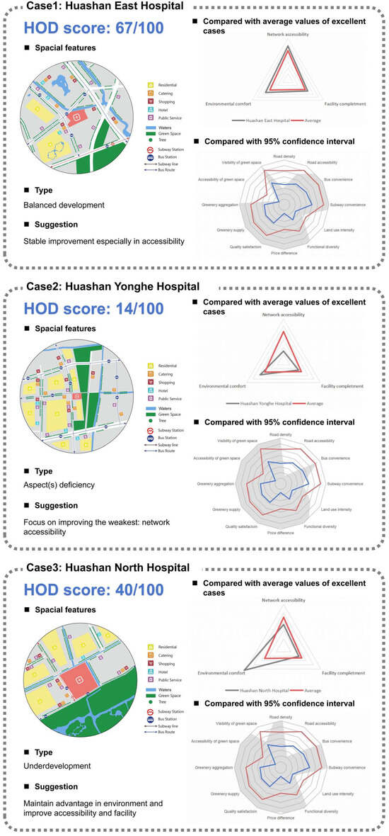 The HOD performances of the three Huashan Hospital branches as control cases were then evaluated both against the prototype and through numerical metrics, enabling the proposal of improvement strategies while validating the methodology’s feasibility (Figure 11). The results indicate that despite belonging to the same prestigious healthcare system where the main campus is listed in the excellent cases, the branches exhibit distinct developmental deficits. These disparities align with varying stages of surrounding urban development, mirroring common challenges in hospital-adjacent area development in many hospitals. According to the results, three different levels of HOD performance can be classified and corresponding improvement strategies can be proposed.