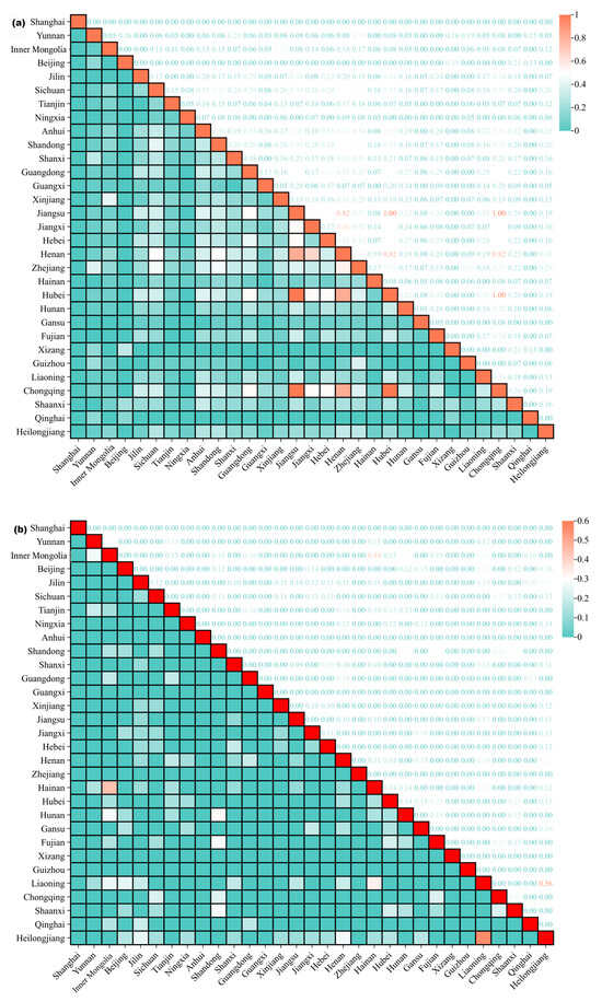 (a) Comprehensive similarity matrix, (b) network edge weight matrix, and (c) inter-provincial similarity–difference matrix.