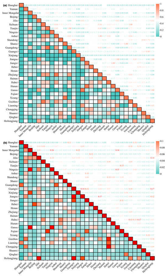 This section explores the similarities and differences among high-quality tourism destinations across provinces through the analysis of a comprehensive similarity matrix, network edge weight matrix, and inter-provincial similarity–difference matrix. First, the comprehensive similarity matrix illustrates all the four similarities in image perception among provinces (Figure 6a). The results show that the similarity between most provinces is relatively low (>0.2). Notably, the similarity between Jiangsu, Henan, Hubei, and Chongqing exceeds 0.5, indicating high consistency in image perception. Second, the analysis of network edge weights unveils the dynamic and global similarities among various provinces (Figure 6b). Most edge weights between provinces range from 0.2 to 0.6. Provinces such as Jilin and Beijing, Shaanxi and Jilin, Gansu and Jilin, Gansu and Shaanxi, and Gansu and Beijing exhibit values greater than 0.5. In contrast, provinces like Guizhou and Xinjiang, and Guizhou and Guangxi show lower edge weights.