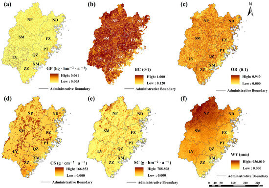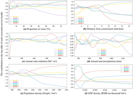 - Water resources, climate, and human activities significantly influence ESB formation. Of the 17 “natural-socioeconomic” factors analyzed, the proportion of water bodies, distance from construction land, annual solar radiation, total annual precipitation, population density, and GDP density are the primary determinants affecting ES cluster formation in Fujian Province.