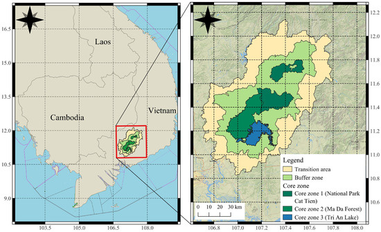The study area is located within the Dong Nai Biosphere Reserve (formerly known as the Cat Tien Biosphere Reserve), which holds a strategically important position for maintaining the ecological and economic balance of the region and for preserving the unique natural complexes of the southern lowland territories of the Socialist Republic of Vietnam. The reserve is situated in Dong Nai Province, in the southeastern part of southern Vietnam (Figure 1). In this region, the Central Highlands Plateau gradually transitions into the Nam Bo river delta. The total area of the reserve is approximately 9700 km2 and includes a strictly protected zone (core) within Cat Tien National Park and the Ma Da Forest, a buffer zone designated for sustainable forest use, and a transition zone that includes agricultural lands, aquaculture sites, and settlements [21].