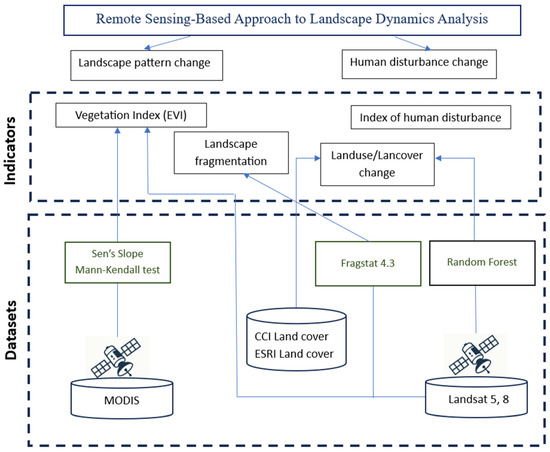 Landscape dynamics within the study area were assessed using remote sensing (RS) methods, including the calculation of vegetation indices, land use/land cover (LULC) classification, landscape metrics, and HDI (Figure 3).