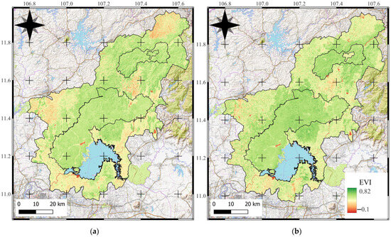 Derived from NDVI, EVI gives finer gradations of biomass to provide a comprehensive analysis of changes in ecosystem characteristics. One of its key advantages is the ability to minimize background noise from soil and atmospheric conditions, which is especially important in tropical areas characterized by high biomass density [28].