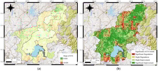 In this study, a significance level of α = 0.05 was adopted: trends were considered statistically significant when p ≤ 0.05 and insignificant otherwise. Combining the Mann–Kendall test with Sen’s slope estimator allowed the classification of EVI trends into five categories: significant improvement (slope > 0, p ≤ 0.01), slight improvement (slope > 0, 0.01 < p ≤ 0.05), stable (p > 0.05), slight degradation (slope < 0, 0.01 < p ≤ 0.05), and significant degradation (slope < 0, p ≤ 0.01) [30].