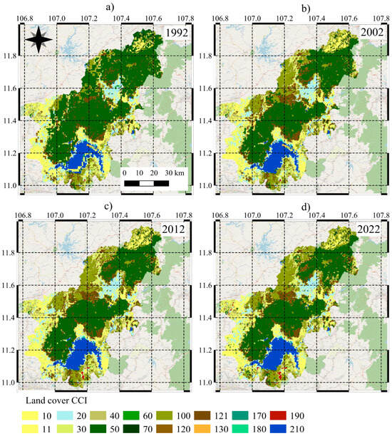 These datasets are openly provided by the European Space Agency (ESA) and were acquired through the “Global Monitoring of Essential Climate Variables” program, commonly referred to as the “ESA Climate Change Initiative”. This program is designed to deliver a comprehensive, accurate, and timely response to the demanding requirements for highly stable, long-term satellite-derived climate products. Land cover maps were obtained from the official ESA repository and subsequently processed in QGIS 3.34, where they were clipped to the boundaries of the study area, and the spatial extent of each land cover type was quantified [33].
