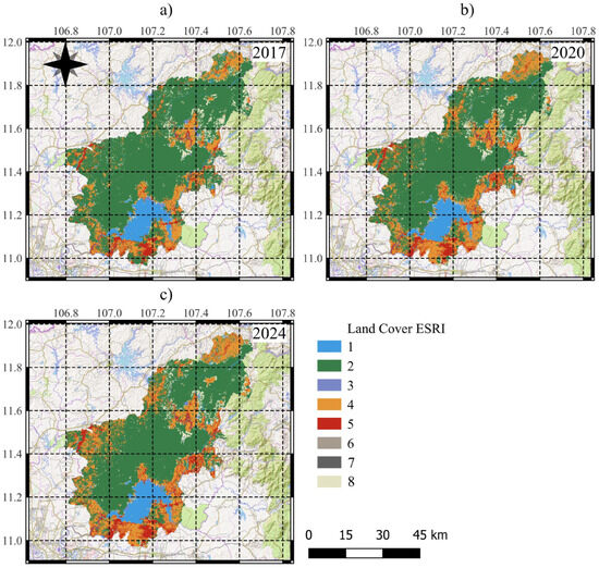 ESRI provides open-access annual land cover maps at 10 m spatial resolution for the period 2017–2024. Existing artificial intelligence (AI)-based land classification models were enhanced through the integration of a massive training dataset consisting of billions of human-labeled image pixels. These models were applied to the entire Sentinel-2 imagery collection for each year, encompassing over 2,000,000 Earth observations across six spectral bands, which formed the basis for the land cover maps. The maps were downloaded from the official ESRI repository, clipped to the boundaries of the study area using QGIS 3.34, and the area of each land cover type was subsequently calculated [34].