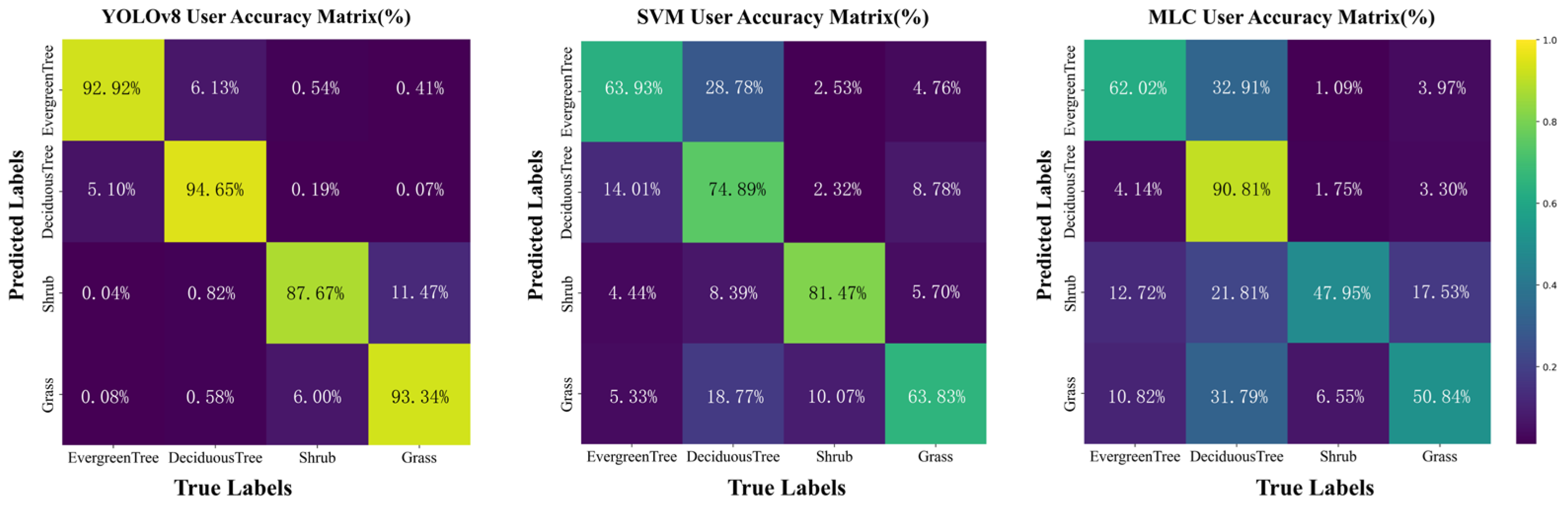 As shown in Figure 6, the user accuracy of evergreen trees, deciduous trees, shrubs, and grasslands in the extraction results of the YOLO v8 deep learning model reached the highest values, which were 92.92%, 94.65%, 87.67%, and 93.34%, respectively. In the SVM extraction, the user accuracy of shrubs (81.47%) was higher than that of evergreen trees, deciduous trees and grasslands. In the MLC extraction, deciduous tree user accuracy (90.81%) reached the maximum value, while shrub user accuracy (47.95%) was the lowest, with the most severe misclassification.