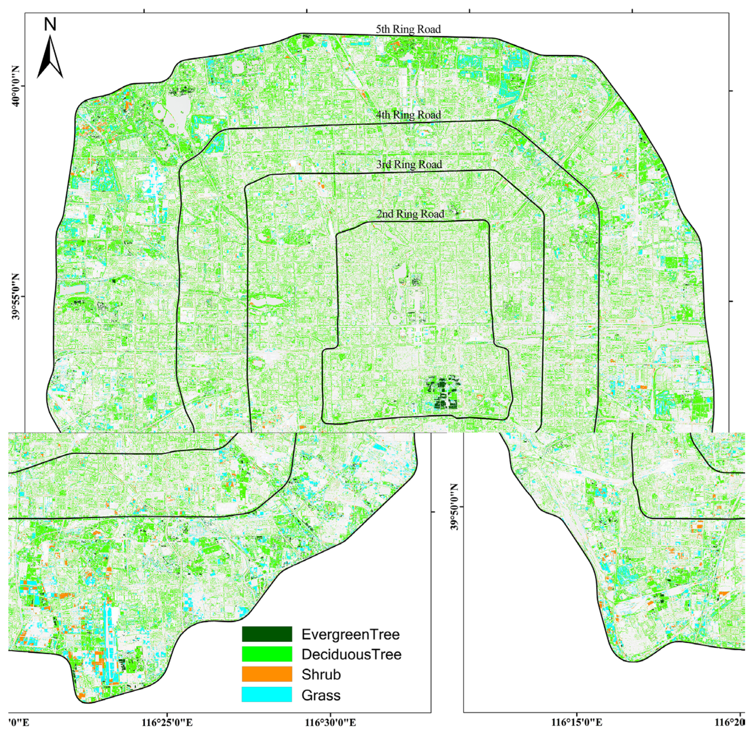 Beijing is located between 115°25′ and 117°30′ east longitude and 39°28′ and 41°25′ north latitude, covering a total area of approximately 16,410 km2. Since the implementation of the reform and opening up policy in 1978, Beijing has experienced rapid social and economic development, with a rapid expansion of the city and a significant increase in the construction of urban green spaces. The Fifth Ring Road of Beijing is defined as the study area, with a total area of 666.5 km2. The urban green spaces within the Fifth Ring Road primarily consist of small- and medium-sized patches with diverse vegetation types.