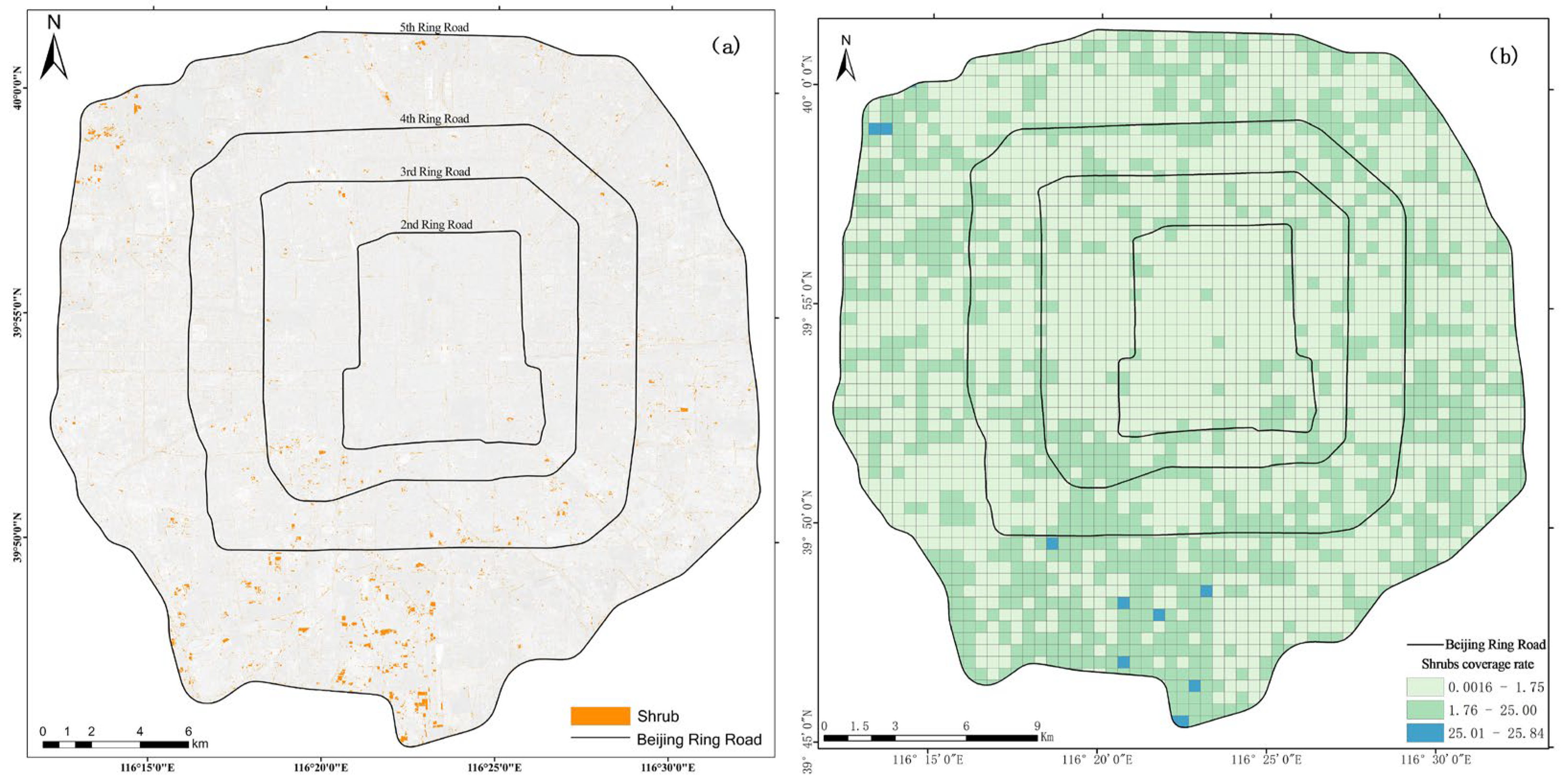 Figure 15. (a) Distribution map of shrubs; and (b) shrub coverage distribution map within the Fifth Ring Road of Beijing.