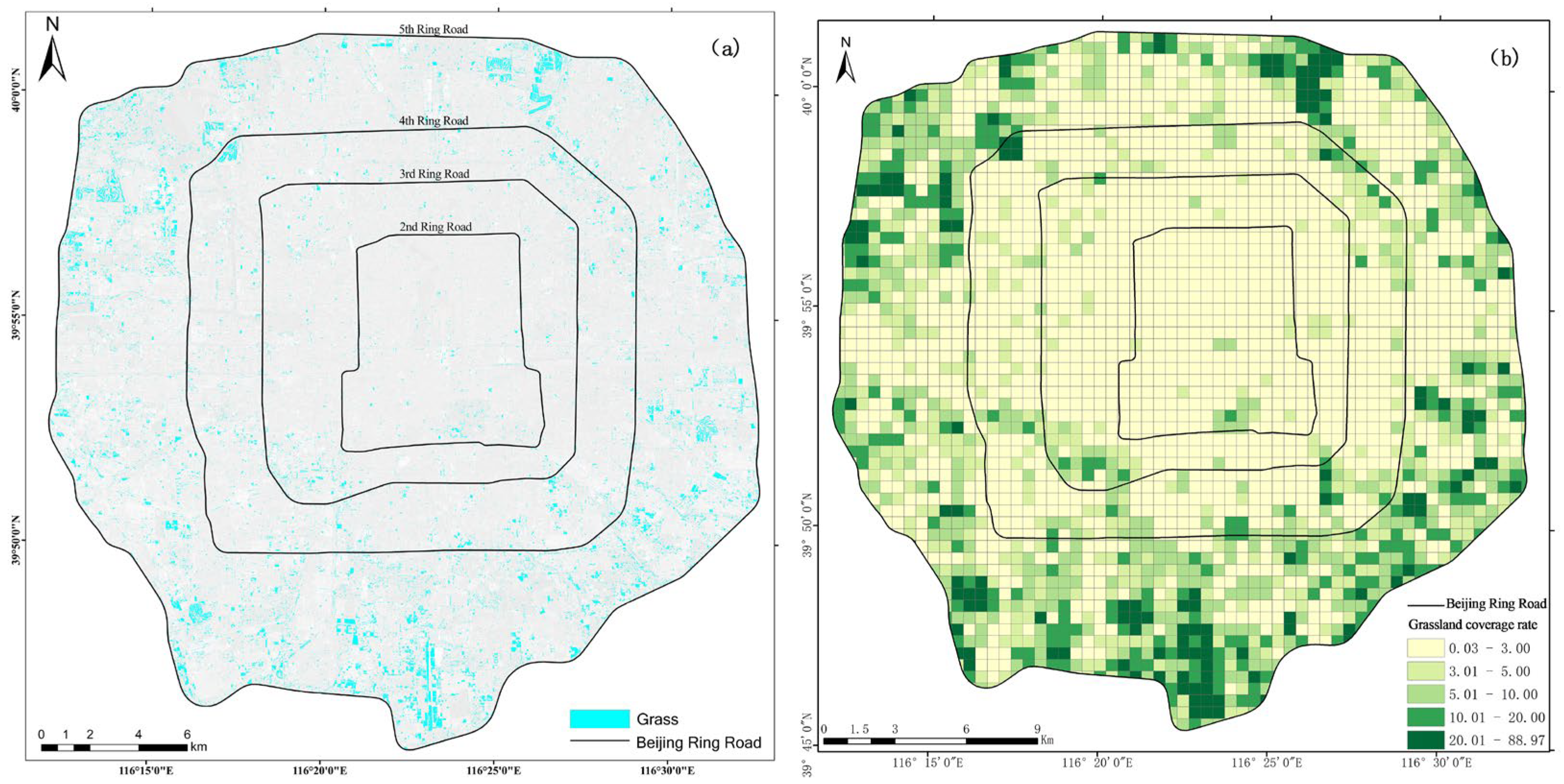 Figure 16. (a) Distribution map of grassland; and (b) grassland coverage distribution within the Fifth Ring Road of Beijing.