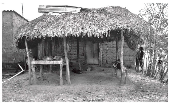 The sealing of communal wells and the lack of infrastructure symbolize broader patterns of exclusion [26]. In contrast, the self-built neighborhood of La Victoria exemplifies the community’s capacity for autonomous development and spatial justice. The La Victoria neighborhood represents a paradigmatic example of community self-management (Figure 8). After the Community Council acquired two hectares of land, families built their homes in a collective process that reaffirms the importance of territorial roots. The houses, built with wattle and daub, wood, and palm, incorporate ancestral techniques and are arranged around patios and huts that function as gathering spaces. The wood-burning stove, for example, not only serves a practical purpose but also symbolizes the heart of the home and the soul of the family.