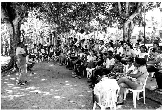 Figure 6. Kuagros, Afro Youth Corporation. Ma-Majarí del Níspero Community Council, meeting July 2018. @Daniel Huertas. A la sombra del almendro (In the shade of the almond tree).