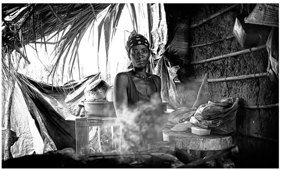 Figure 8. Cooking in the firewood hut. La Victoria neighborhood. Ma-Majari Community of El Níspero, Montes de María, Colombia. 2021. @Daniel Huertas. Cocino para sentir que estoy viva (I cook to feel that I am alive). Some rice, plantain, and some onion. If possible, a piece of chicken or beef. Enilda has arrived at La Victoria, displaced by the violence. With occasional help, she has been building a small mud house and a wood-fired kitchen. As the house grows, the kitchen moves. Always open, like freedom.