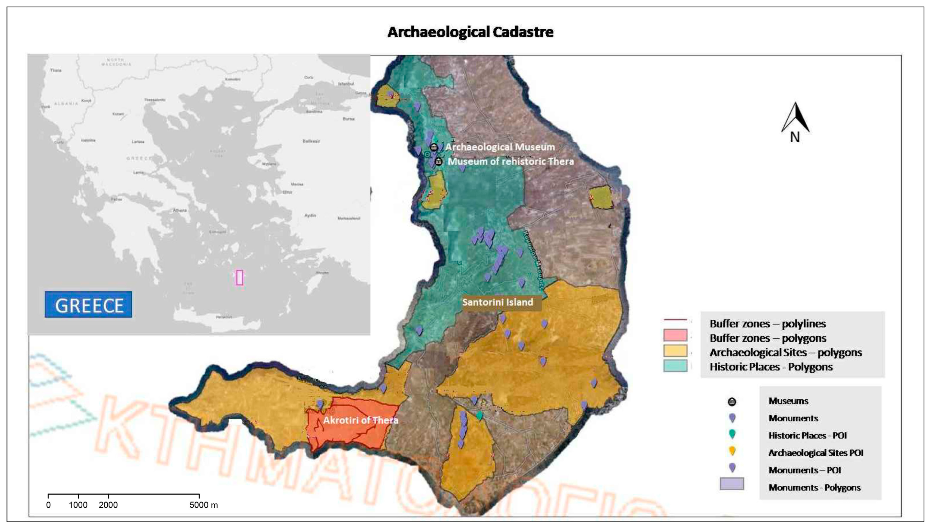 - The Content of the Hellenic Archaeological Cadastre. Available online: https://www.arxaiologikoktimatologio.gov.gr/el/content/periehomeno-tis-pylis (accessed on 10 September 2025).