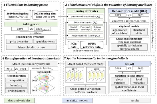 The pandemic provides a natural context for examining these dynamics, as it disrupted housing market equilibria and exposed underlying processes of spatial restructuring. Our guiding research question is therefore: How do intra-urban housing market structures undergo spatial reconfiguration in the post-shock context? More specifically, we examine four interrelated dimensions: (1) overall housing price dynamics, (2) global shifts in the valuation of housing attributes, (3) spatial heterogeneity in the marginal effects of housing variables, and (4) the reconfiguration of submarket boundaries and structures.