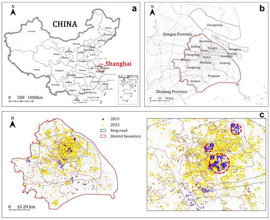 This study focuses on the metropolitan area of Shanghai Municipality, excluding Chongming Island and other outlying islets, as the empirical case study (Figure 2a,b). As a national economic hub and a centrally administered municipality, Shanghai has undergone rapid urbanisation since the Reform and Opening-Up period, evolving into a densely populated and functionally diverse megacity with a mature and spatially stratified housing market. Following two major waves of the COVID-19 pandemic, the city has entered a post-pandemic transition in which the spatial determinants of housing market dynamics are undergoing substantial restructuring.