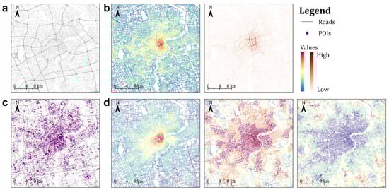 Built-environment indicators derived from the street network and POIs. (a) Street network structure; (b) spatial accessibility metrics: integration and choice values from space syntax analysis; (c) spatial distribution of points of interest (POIs) overlaid on the street network; (d) functional accessibility metrics: density, diversity, and efficiency.