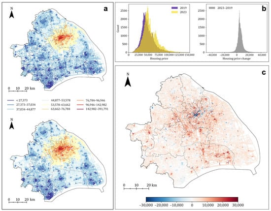 Spatial distribution and change of housing prices (2023 values deflated to 2019 prices using the CPI) based on street network interpolation. (a) Interpolated housing prices in 2019 (top) and 2023 (bottom), classified using Jenks natural breaks derived from pooled 2019–2023 data to ensure comparability across years; (b) Histogram of housing prices in 2019 (purple) and 2023 (yellow), and CPI-deflated price changes between the two years (grey); (c) Spatial distribution of CPI-deflated housing price changes (2023 minus 2019) along the street network.