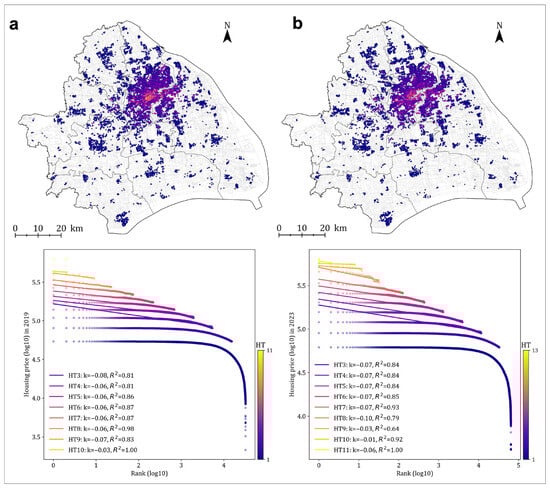 Structural characteristics of Shanghai’s housing price distribution (2023 deflated to 2019 values using the CPI) before and after COVID-19. Spatial distribution and head/tail break classification of housing prices in 2019 ((a), baseline) and 2023 ((b), CPI-deflated to 2019 values), with corresponding rank-size distributions and power-law fitting results. Housing units are color-coded by head/tail break levels (HT). Power-law slope values (k) denote the degree of price variation within each hierarchical level, while coefficients of determination (R2) indicate the goodness of fit to the power-law distribution.