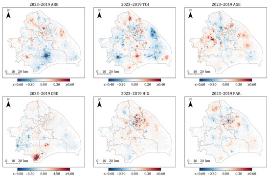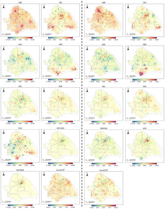 As shown in Table 4, the MGWR specification substantially outperformed the global OLS benchmark, with adjusted R2 improving from 0.785 to 0.895 in 2019 and from 0.751 to 0.886 in 2023. This improvement underscores the necessity of accommodating spatial non-stationarity in hedonic modelling. Results indicate that most neighbourhood facility variables (MAL, KIN, PHA) and built-environment indicators (CHO, INT, EFF) operate at relatively global scales, exerting spatially consistent influences on housing prices. By contrast, structural characteristics (e.g., ARE, AGE) and selected accessibility measures display pronounced spatial heterogeneity, functioning as local variables with coefficients that varied considerably across neighbourhoods. This contrast illustrates a transition from global to local determinants, reinforcing the context-dependent and uneven nature of housing valuation processes.