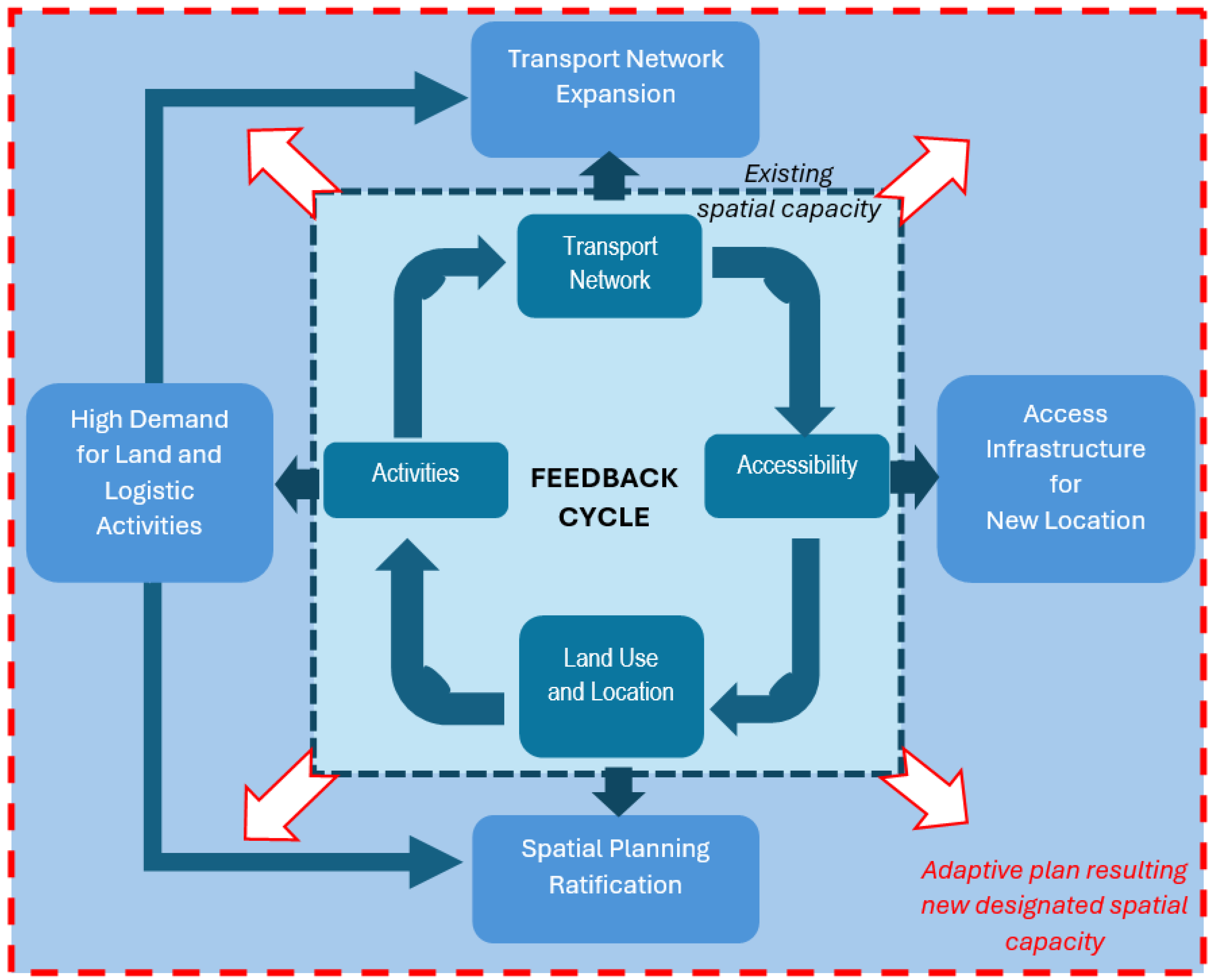Planning process, feedback loops, and intervention | A new transport network follows a new industrial area and vice versa | New logistic infrastructure (expansion plan) versus the limit of spatial capacity | Ongoing and future impacts on the protected area | Adaptive and compromise-driven land use planning of future scenarios (anticipative plan) |
