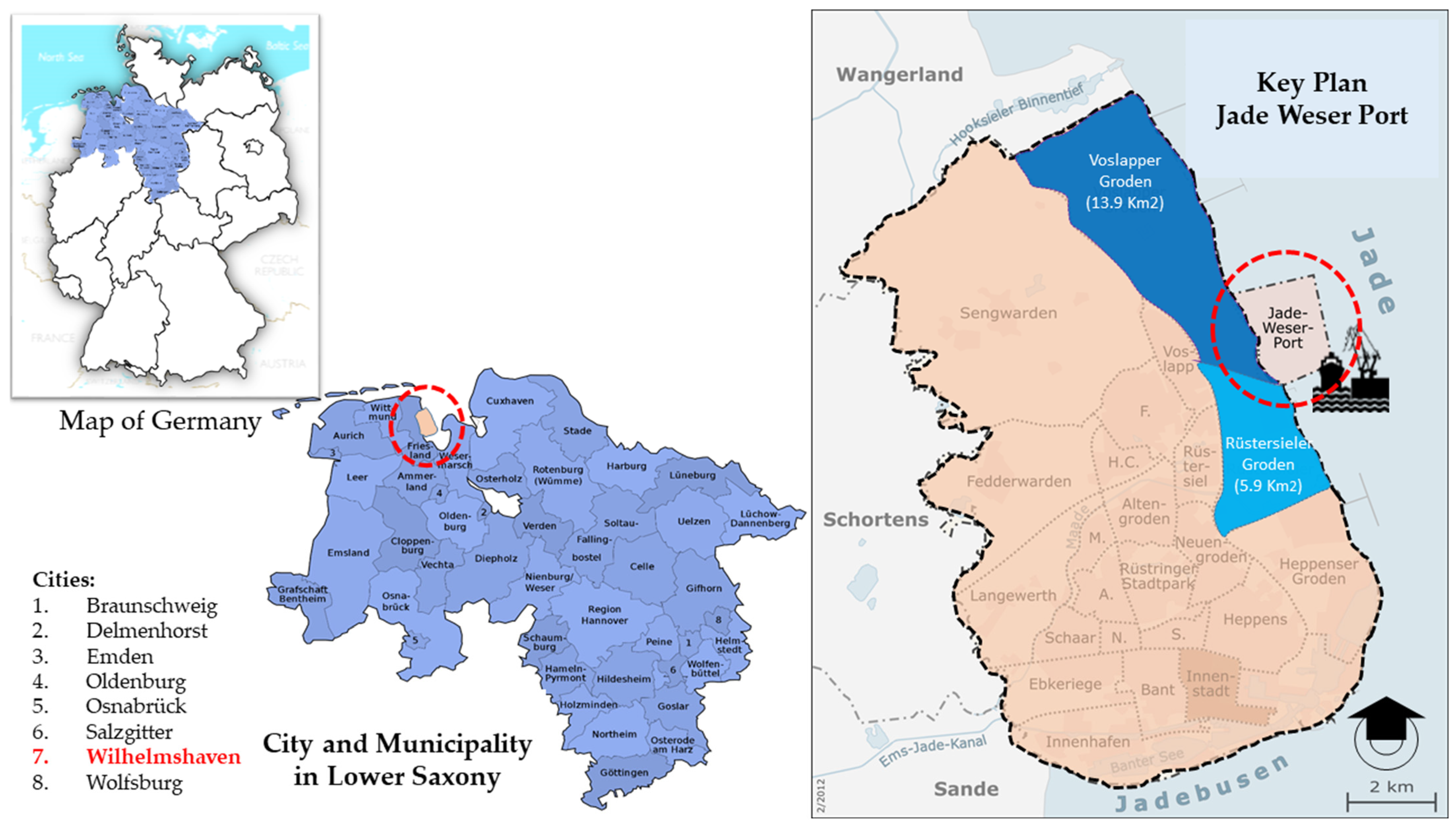 - Stadt Wilhelmshaven Stadt. Wilhelmshaven: Daten und Fakten. 2023. Available online: https://www.wilhelmshaven.de/Wirtschaft/Fakten.php (accessed on 25 July 2025).