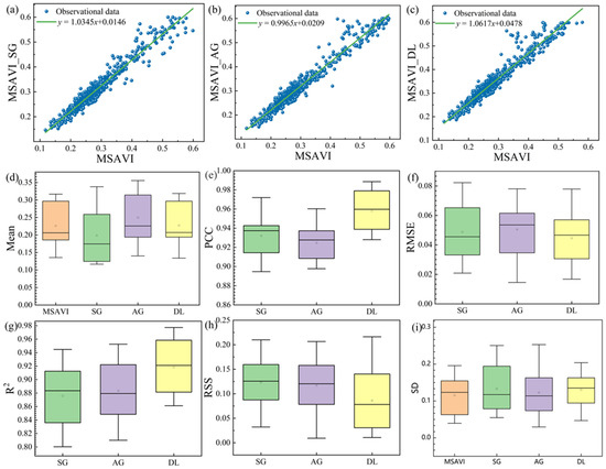Correlation between reconstructed and original MSAVI values. (a–c) Linear regression between the reconstructed and original MSAVI values using the Savitzky–Golay, Double Logistic, and Asymmetric Gaussian methods; (d–i) Comparison of Mean, PCC, R2, RMSE, RSS, and SD values for each reconstruction method.