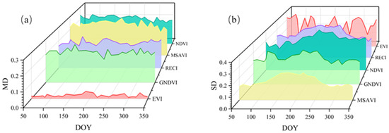 Given the vegetation dynamics in the study area, we evaluated the sensitivity of each VI to mining activities by analyzing their values over the annual cycle. The key evaluation metrics include the Mean Difference (MD) and SD (Figure 7). MD quantifies the difference between affected and unaffected regions and thus reflects each VI’s sensitivity to mining disturbances, whereas SD measures the temporal stability of each VI under mining influence. A higher MD indicates greater sensitivity to mining impacts, whereas a lower SD indicates greater consistency in the VI response. Notably, SD exhibited pronounced seasonal variability, with the most substantial differences between affected and unaffected areas occurring during the summer months.
