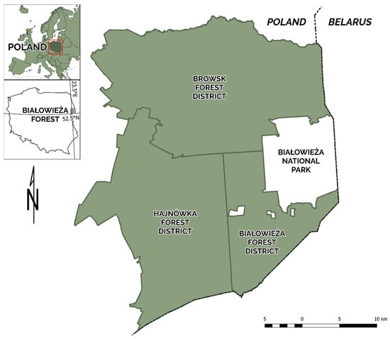 The Białowieża Forest is located in eastern Poland, next to the Belarusian border (Figure 1). It comprises 4 separate units: Białowieża National Park and three forest districts named Białowieża, Browsk and Hajnówka. The first unit on this list is under strict protection (IUCN level 2). Three forest districts comprise the managed part of Białowieża Forest with a combined area of 50,559.45 hectares. This was the study area in this research. The region is characterised by a temperate continental climate with mean annual precipitation of 640 mm and mean annual temperature of 6.8 °C (1950–2018), mixed lowland forests, and a mosaic of habitats ranging from dry coniferous forests to wet alder communities.