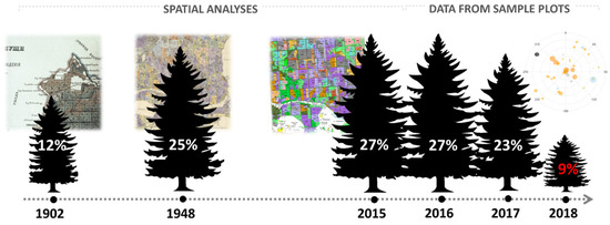 Changes in the area share of spruce stands. Data from 1902–2015 comes from historical cartography materials and forest databases. Data from 2016–2018 are derived from sample plots established during the bark-beetle outbreak.