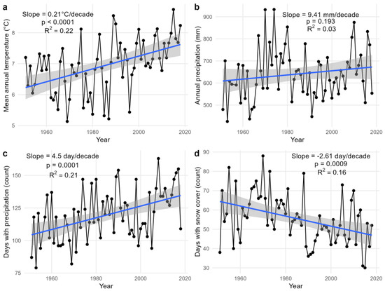 Annual mean temperature (a), annual sum of precipitation (b), days with precipitation (c), and days with snow cover (d) calculated from data obtained from the Białowieża meteorological station for the period of 1951–2018 (black dots and lines—climatic data, blue line—linear trend).