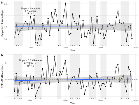 Selyaninov hydrothermal coefficient (k) for the summer half-year and historical recordings of bark-beetle outbreaks (grey background) (a) and Standardised Precipitation–Evapotranspiration Index for 12 months using December values and historical recordings of bark-beetle outbreaks (grey background) (b) (black dots and lines—climatic data, blue line—linear trend).