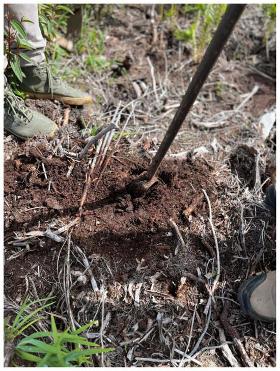 At each site, using a stainless-steel auger (5 cm diameter), composite samples were collected from two depth intervals (10 cm and 40 cm) across three land use types (natural forest, open land, and cultivated areas), with three replicates per combination (totalling 54 samples for C, N, and pH analysis and 36 for respiration measurements). Samples were homogenised, air-dried, and sieved (2 mm mesh) prior to analysis. In this study, organic carbon was determined using the dry combustion method with an elemental analyser at 900 °C. Total nitrogen was measured via the micro-Kjeldahl digestion method [], while soil pH was analysed potentiometrically in 1:2.5 soil-water suspensions []. Microbial respiration was quantified through 7-day incubations (25 °C) using the closed bottle method with KOH trapping and HCl titration [].