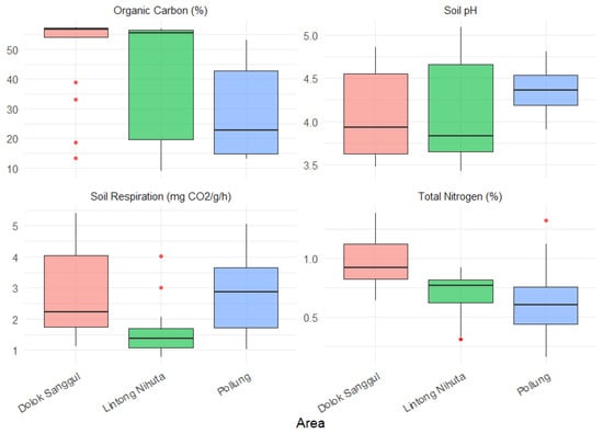 The soil chemical parameters were analysed to identify differences and similarities in soil characteristics across the three observation areas. Figure 5 and Figure 6 show the data distribution of organic carbon (OC) (%), total nitrogen (TN) (%), pH, and soil respiration rate (mg CO2/day), on the three areas (Dolok Sanggul, Lintong Nihuta, and Pollung) and three types of land cover (open land, cultivated land, and natural forest). The data were visualised using boxplots to show the median, quartiles, and distribution of values for each parameter.