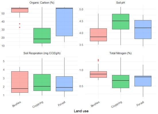 Based on Figure 6, a comparison of three types of land use—bushland, cropland, and forest—showed significant differences in the measured soil parameters. The highest OC content was consistently found in forestland, with a wide range reaching more than 50%. Cropland had the lowest OC content, which could be attributed to the intense land cultivation and harvesting practices that contributed to the decline in soil organic matter. This is in line with global meta-analysis [], which showed that land use changes from forest to cropland caused a significant decrease in soil carbon stocks.