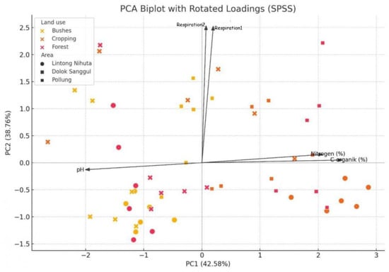 The Principal Component Analysis (PCA) of peat soil characteristics in Humbang Hasundutan highlands revealed two dominant dimensions of variation, collectively explaining 81.34% of total variance (Table 6). The first component (PC1), accounting for 42.58% of variance, captured the fundamental biogeochemical axis of peat soils, with strong positive loadings for OC (0.937) and TN (0.803), and a negative loading for pH (−0.774). This pattern reflects the well-established relationship between organic matter accumulation and acidification in waterlogged peat systems, where anaerobic conditions preserve nitrogen content while promoting the formation of organic acids []. The inverse correlation between pH and C/N in PC1 highlights how natural peat formation processes create chemically distinct environments compared to mineral soils.