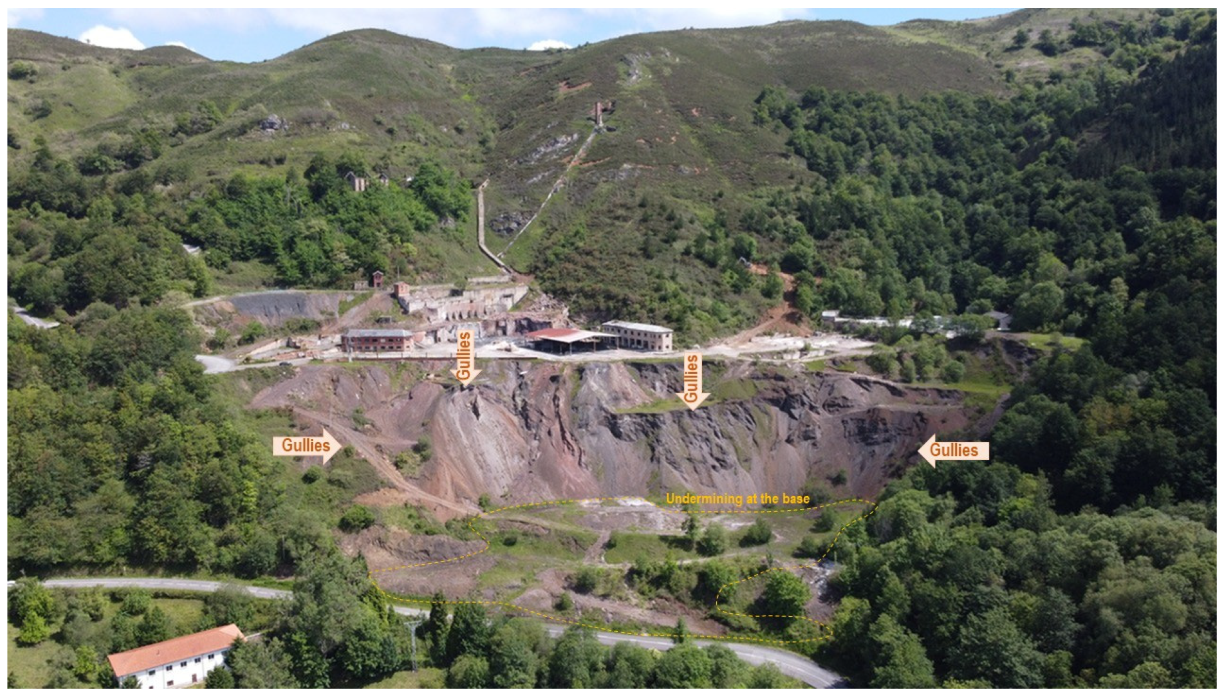 Figure 1). It is located on the side of the local road AS-231 (Peñamiel—Pola de Lena), on the southwest face of Mount Campusas, located 600 m (horizontal distance) from the nearest residential building of Muñón Cimero. The Muñón stream, which flows into the Lena River, originates just a few meters below the mining site.