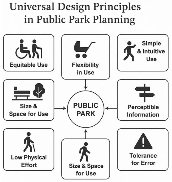 Universal Design (UD) principles serve as a guiding framework for evaluating spatial inclusion in public environments [5]. When applied to urban parks, these principles inform decisions on path gradients, seating, signage, sensory cues, and spatial connectivity [17]. Figure 1 shows a conceptual diagram illustrating how the seven core principles of Universal Design—Equitable Use, Flexibility in Use, Simple and Intuitive Use, Perceptible Information, Tolerance for Error, Low Physical Effort, and Size and Space for Approach and Use—are operationalized in the planning of accessible public parks. Visual elements such as tactile paving, ramp gradients, signage at multiple heights, and spatial arrangements for varied user needs are depicted to align with these principles.