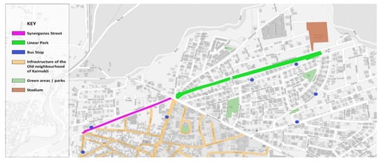 The Kaimakli Linear Park, situated in the historically rich and socially diverse neighborhood of Kaimakli in Nicosia, Cyprus, serves as the focus of this study. As illustrated in Figure 2, the park runs longitudinally through the neighborhood along Synergasias Street and intersects a series of diverse urban typologies, from dense residential areas to civic and athletic facilities. The park spans approximately 1.3 km in length and covers 12,000 square meters.