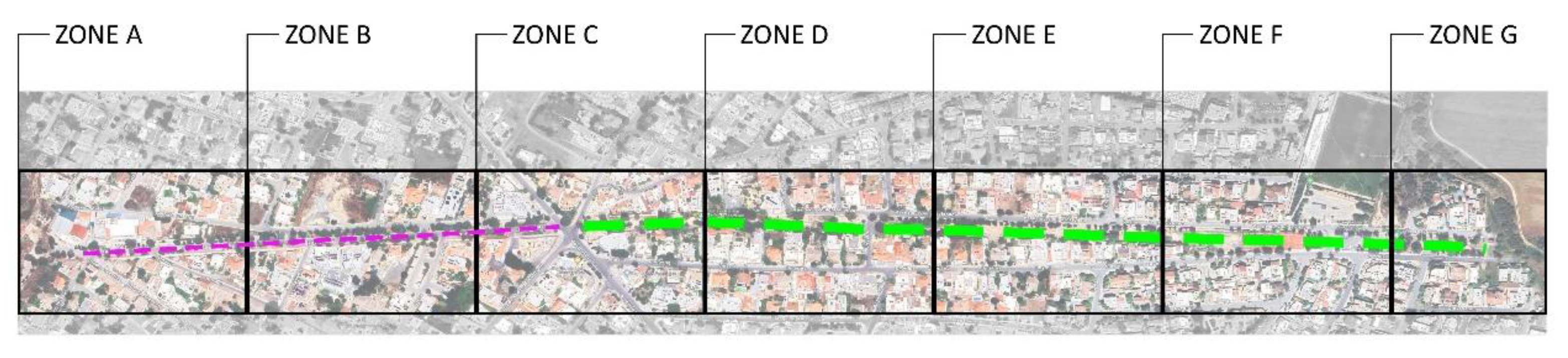 The core empirical component of this research is a case study of Kaimakli Linear Park, grounded in direct on-site fieldwork. The park was divided into seven functional zones (Zones A–G), each evaluated through spatial mapping, observational audits, and design assessments based on Universal Design criteria. A customized checklist, derived from international accessibility guidelines, was used to systematically record field data.